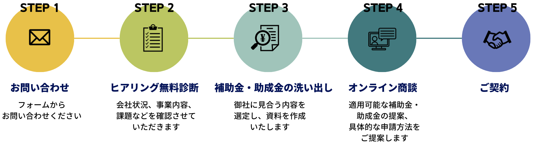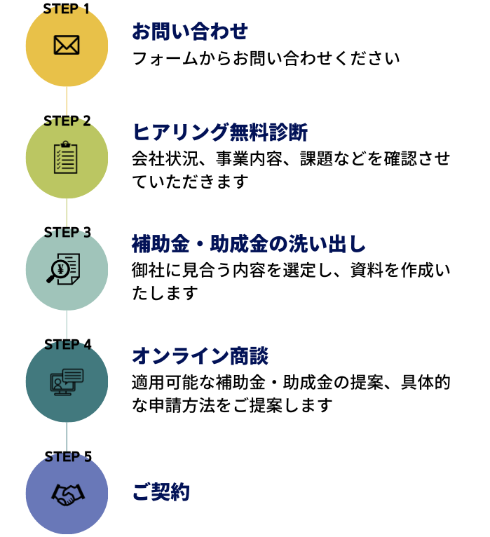 雇用関連、省エネ関連、再エネ関連、IT関連、事業再構築補助金、ものづくり補助金、持続化補助金等、国、都道府県、市区町村の、各種補助金・助成金の申請代行に対応致します。また、各種補助金・助成金を用いたサービスの導入も可能です。